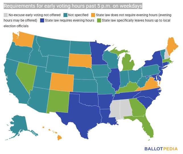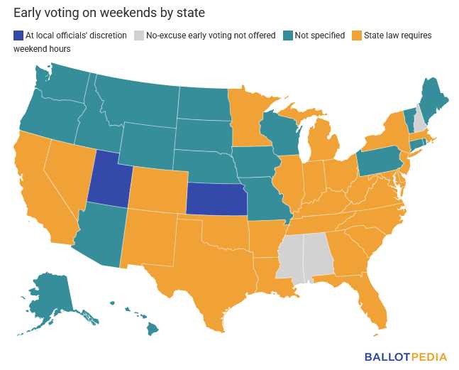 As of January 2026, 26 states require early voting on at least some weekend days, and 21 states do not specify whether weekend voting is required in their statutes or give local officials discretion to set the dates of ...